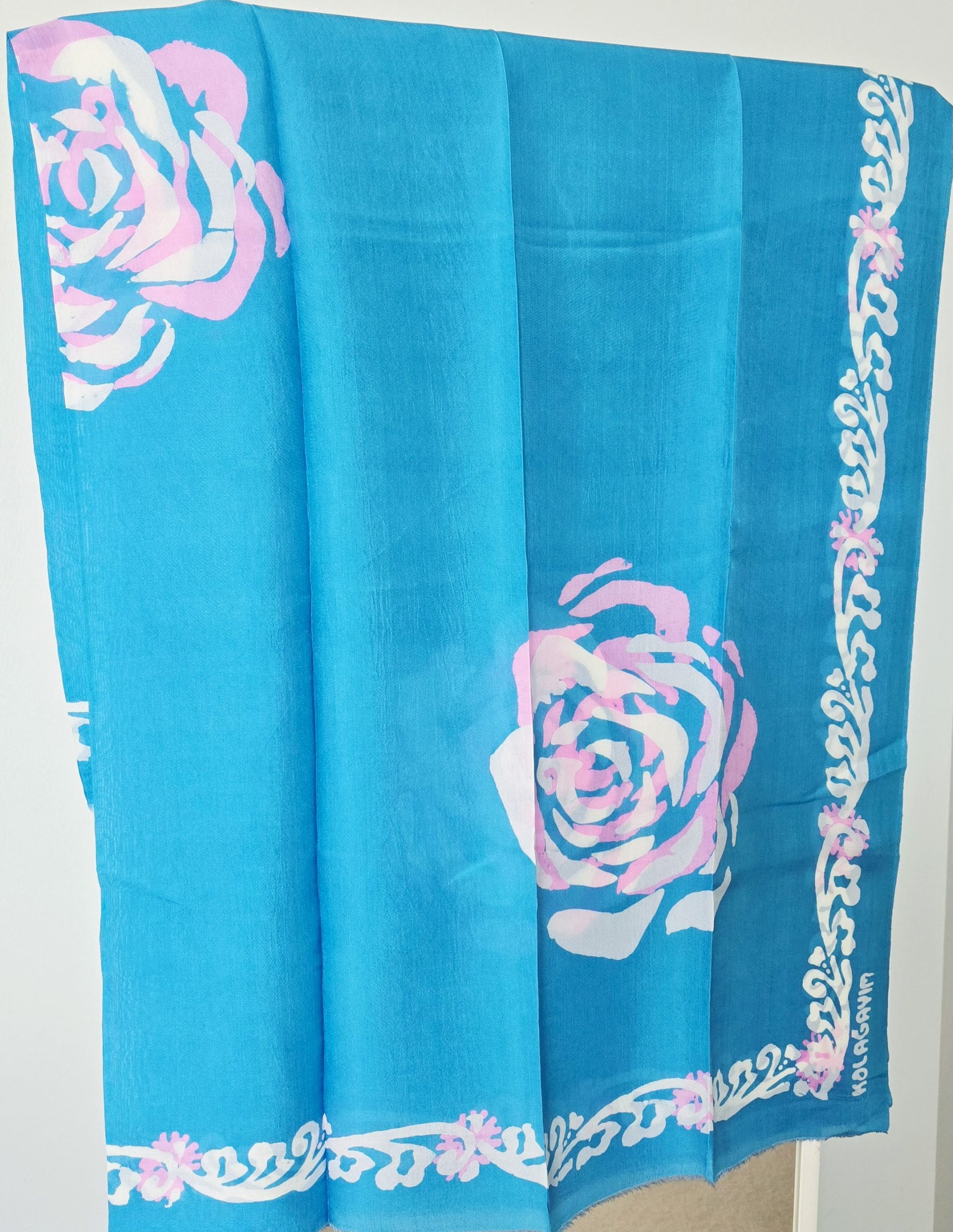 September 22, 2025Bright Blue Kelagayi scarf with White and Pink Roses patterns 120cm x 120cm